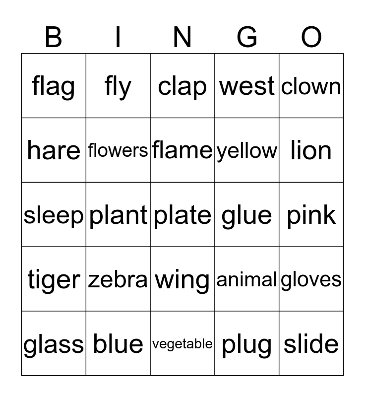 This bingo card has a free space and 29 words: black, blue, clap, clock, clown, flag, flowers, flame, glue, gloves, glass, plant, plug, slide, sleep, slug, vegetable, animal, lion, tiger, zebra, monkey, yellow, pink, hare, fly, wing, west and south.