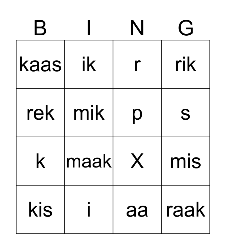 This bingo card has 21 words: i, e, ik, sem, aa, p, kaas, r, X, s, k, rik, raak, mip, mik, mek, kis, maak, rek, mis and pep.