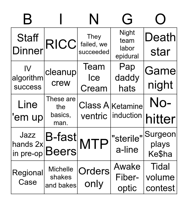 This bingo card has a free space and 24 words: Regional Case, B-fast Beers, Team Ice Cream, Awake Fiber-optic, Death star, Staff Dinner, RICC, They failed, we succeeded, Ketamine induction, No-hitter, Line 'em up, cleanup crew, "sterile" a-line, Surgeon plays Ke$ha, IV algorithm success, Michelle shakes and bakes, Orders only, Night team labor epidural, Game night, Jazz hands 2x in pre-op, These are the basics, man., MTP, Pap daddy hats and Tidal volume contest.