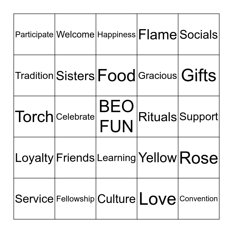 This bingo card has a free space and 24 words: Friends, Fellowship, Food, Service, Socials, Participate, Tradition, Welcome, Rituals, Learning, Gracious, Torch, Yellow, Rose, Sisters, Love, Support, Happiness, Gifts, Celebrate, Convention, Loyalty, Flame and Culture.