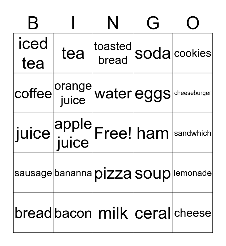 This bingo card has a free space and 24 words: bananna, bacon, water, bread, cookies, iced tea, coffee, tea, ham, pizza, eggs, juice, soup, lemonade, orange juice, ceral, sandwhich, toasted bread, cheeseburger, apple juice, cheese, sausage, soda and milk.