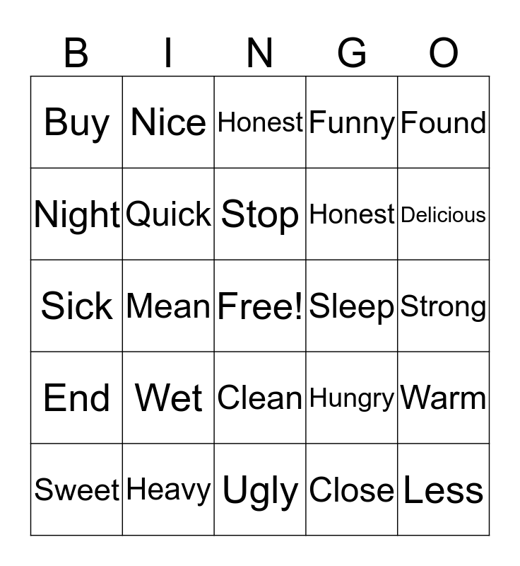 This bingo card has a free space and 29 words: Sweet, Happy, Mean, Large, Buy, Honest, Quick, Wet, Sleep, Heavy, Strong, Less, Ugly, Close, Delicious, Same, Clean, End, Found, Sick, Hungry, Buy, Honest, Night, Funny, Nice, Warm, Stop and Fast.