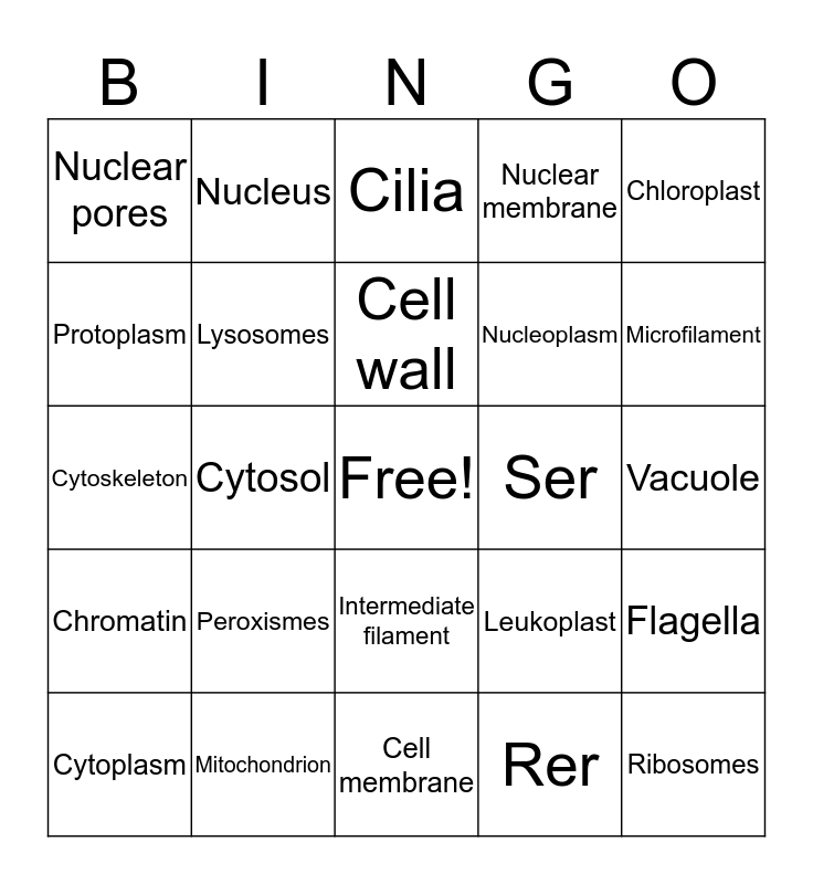 This bingo card has a free space and 28 words: Flagella, Microtubule, Nucleoplasm, Rer, Protoplasm, Cilia, Nucleus, Chromatin, Ser, Cytoplasm, Cytoskeleton, Nuclear membrane, Mitochondrion, Cell membrane, Microfilament, Nucleolus, Peroxismes, Lysosomes, Cell wall, Intermediate filament, Nuclear pores, Golgi body, Ribosomes, Cytosol, Vacuole, Leukoplast, Chloroplast and Chromoplast.
