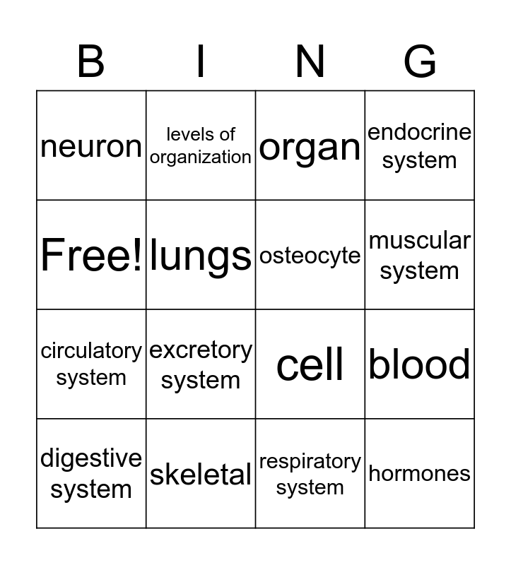 This bingo card has 16 words: skeletal, blood, organ, neuron, circulatory system, levels of organization, cell, respiratory system, Free!, lungs, digestive system, endocrine system, excretory system, muscular system, osteocyte and hormones.