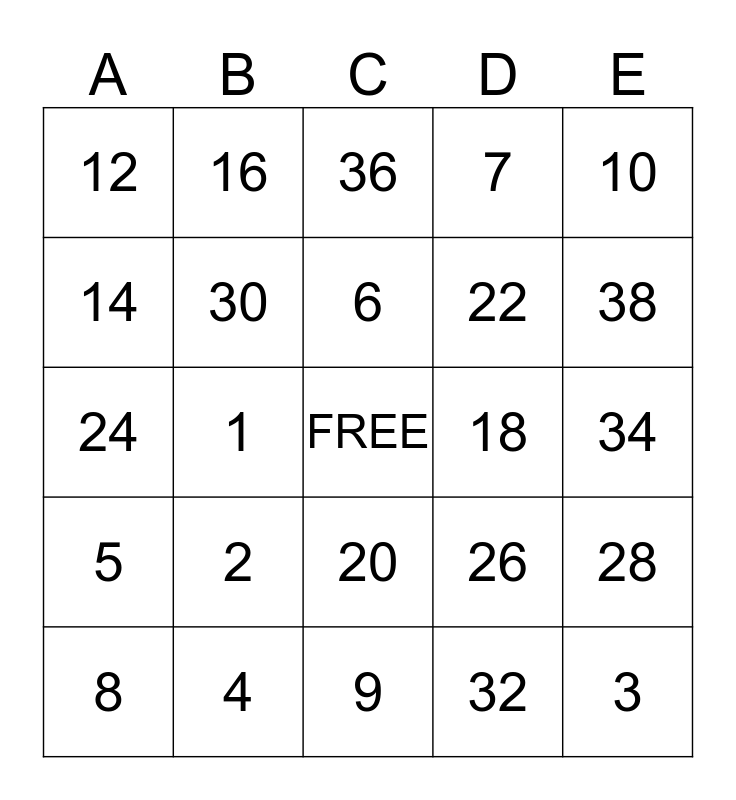 This bingo card has a free space and 24 words: 2, 4, 6, 8, 10, 12, 14, 16, 18, 20, 22, 24, 26, 28, 30, 32, 34, 36, 38, 1, 3, 5, 7 and 9.