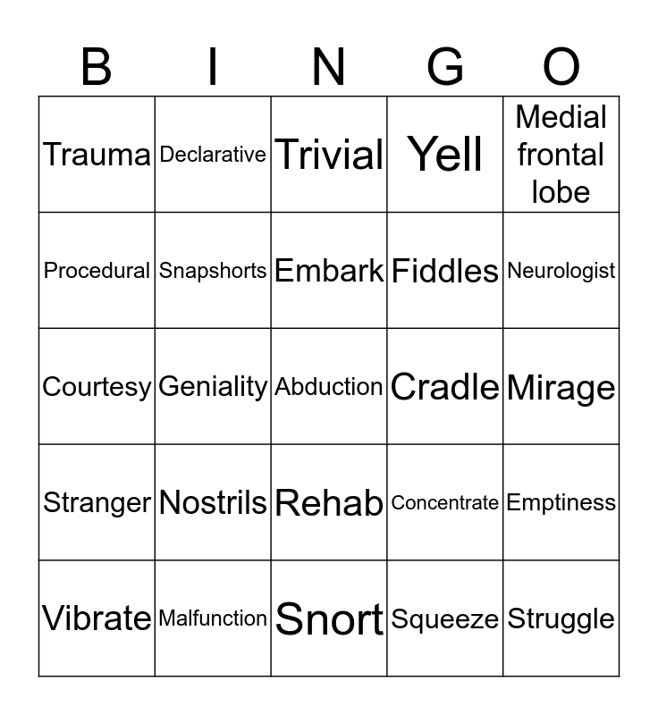 This bingo card has 25 words: Nostrils, Snort, Embark, Vibrate, Medial frontal lobe, Trauma, Procedural, Declarative, Cradle, Rehab, Fiddles, Courtesy, Concentrate, Emptiness, Snapshorts, Struggle, Mirage, Trivial, Neurologist, Geniality, Abduction, Malfunction, Stranger, Yell and Squeeze.