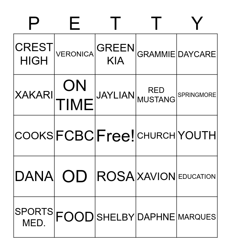 This bingo card has a free space and 24 words: OD, FOOD, JAYLIAN, SPORTS MED., DAYCARE, CREST HIGH, XAKARI, VERONICA, CHURCH, ROSA, RED MUSTANG, COOKS, XAVION, EDUCATION, ON TIME, DAPHNE, YOUTH, GREEN KIA, SPRINGMORE, FCBC, MARQUES, DANA, GRAMMIE and SHELBY.