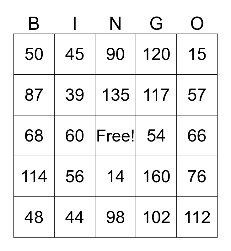 This bingo card has a free space and 24 words: 56, 44, 135, 48, 15, 50, 87, 45, 54, 14, 117, 68, 160, 76, 39, 102, 66, 90, 57, 60, 112, 114, 120 and 98.