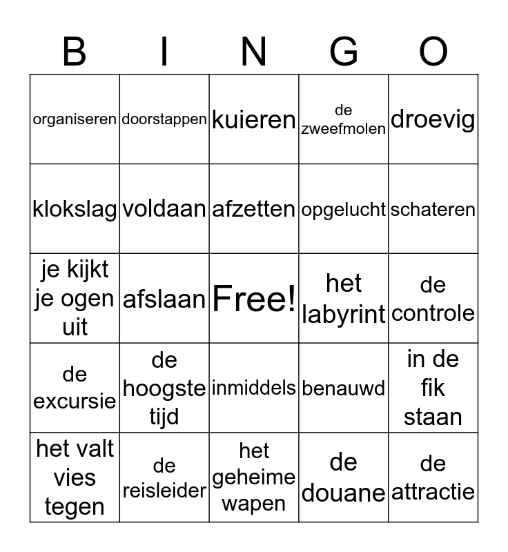This bingo card has a free space and 39 words: uitgelaten, diverse, het spiegelpaleis, voldaan, het valt vies tegen, inmiddels, afzetten, het gaat van kwaad tot erger, droevig, de excursie, afslaan, de zweefmolen, de attractie, de controle, het labyrint, de hoogste tijd, glimlachen, organiseren, acuut, benauwd, klokslag, het geheime wapen, opgelucht, schateren, de wandeltocht, het uitgieren, hoewel, bezorgd, de wildwaterbaan, doorstappen, het paspoort, in de tussentijd, kuieren, de reisleider, de douane, het standbeeld, in de fik staan, je kijkt je ogen uit and slenteren.
