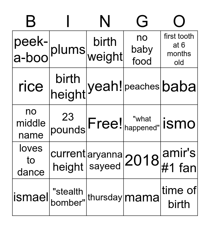 This bingo card has a free space and 29 words: ismael, november, 23 pounds, 6 teeth, peek-a-boo, birth weight, birth height, current height, "what happened", "stealth bomber", ismo, time of birth, thursday, mama, baba, 11 months old started walking, aryanna sayeed, loves to dance, first tooth at 6 months old, no middle name, 2018, 8, peaches, rice, no baby food, plums, amir's #1 fan, yeah! and loves airplanes.