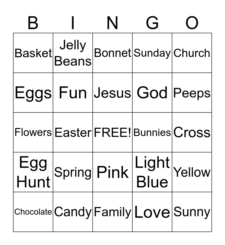 This bingo card has a free space and 24 words: Spring, Candy, Jesus, Chocolate, Church, Basket, Eggs, Jelly Beans, Bunnies, Pink, God, Flowers, Light Blue, Yellow, Fun, Love, Cross, Bonnet, Peeps, Easter, Sunny, Egg Hunt, Sunday and Family.