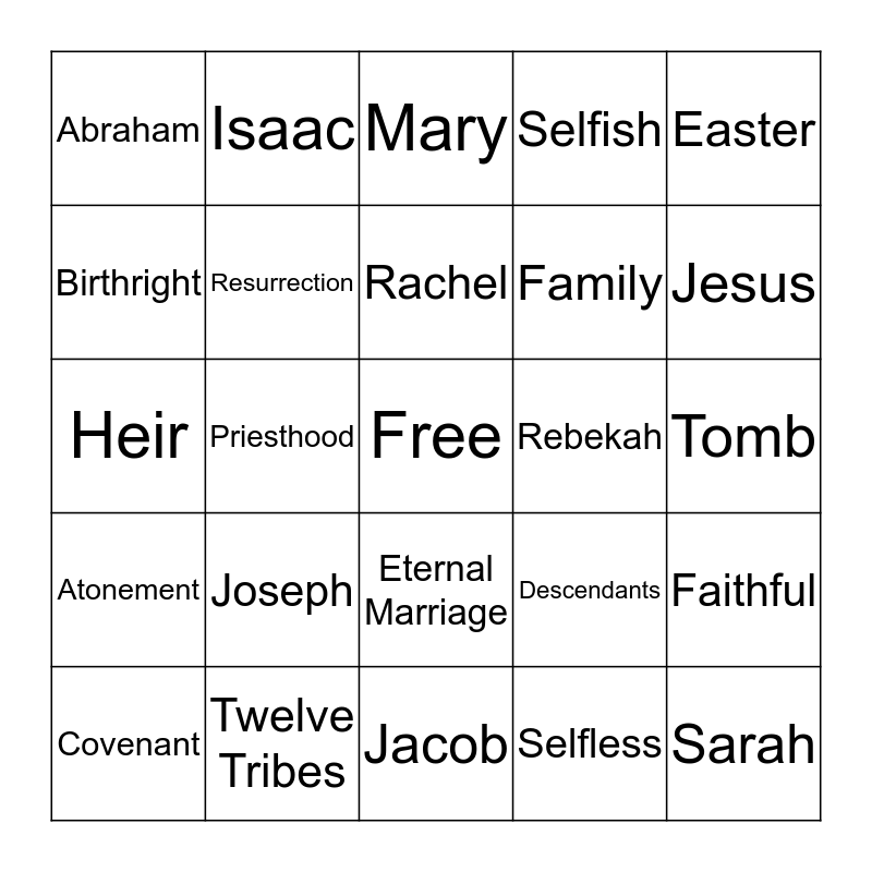 This bingo card has a free space and 25 words: Joseph, Jacob, Rachel, Covenant, Easter, Abraham, Birthright, Isaac, Rebekah, Eternal Marriage, Family, Heir, Descendants, Faithful, Resurrection, Eternal Life, Tomb, Mary, Jesus, Priesthood, Sarah, Twelve Tribes, Atonement, Selfish and Selfless.