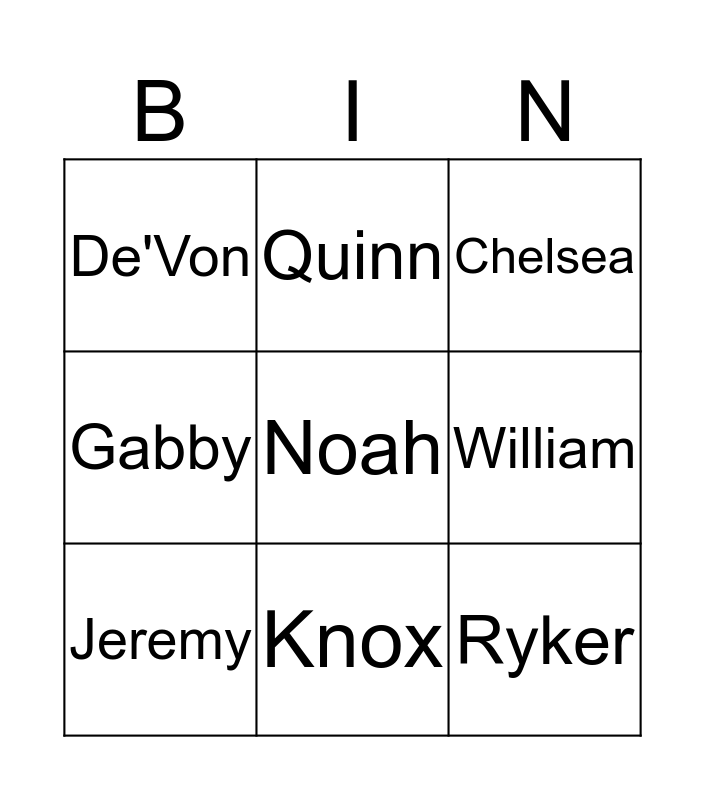 This bingo card has 17 words: Aaria, Chase, Chelsea, De'Von, Norah, Gabby, Jenna, Jeremy, Knox, William, Mallory, Makaylah, Noah, Quinn, Ryker, Shannon and Vibhav.
