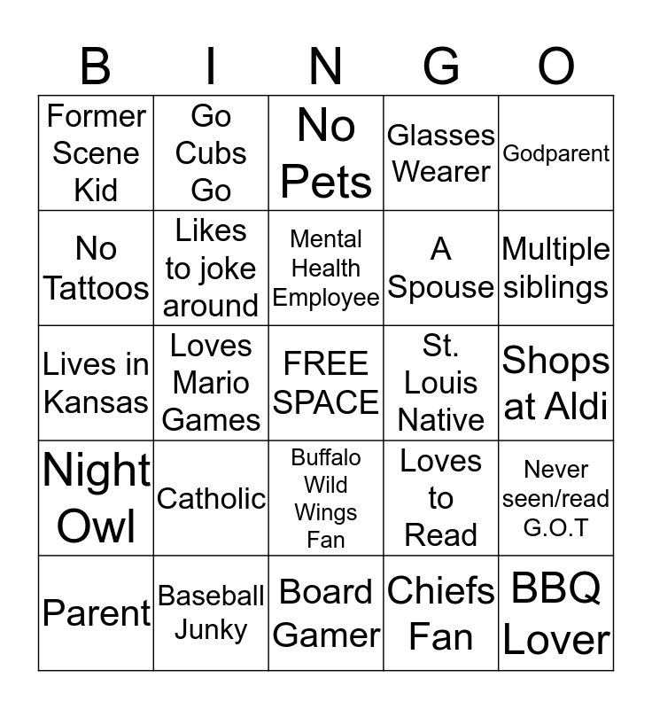 This bingo card has a free space and 24 words: Catholic, Baseball Junky, Mental Health Employee, Parent, Godparent, Former Scene Kid, No Tattoos, Go Cubs Go, St. Louis Native, Buffalo Wild Wings Fan, A Spouse, Lives in Kansas, Loves to Read, Never seen/read G.O.T, Likes to joke around, Chiefs Fan, Shops at Aldi, No Pets, Multiple siblings, Loves Mario Games, BBQ Lover, Night Owl, Glasses Wearer and Board Gamer.