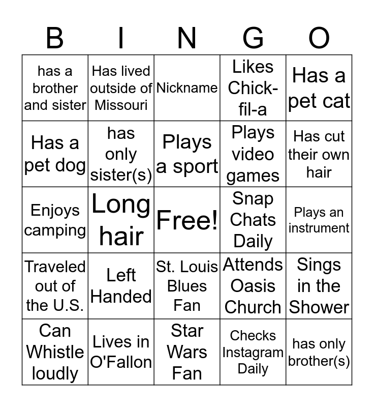 This bingo card has a free space and 24 words: Left Handed, Lives in O'Fallon, Plays a sport, Can Whistle loudly, Has a pet cat, has a brother and sister, Has a pet dog, Has lived outside of Missouri, Snap Chats Daily, St. Louis Blues Fan, Plays video games, Enjoys camping, Attends Oasis Church, Sings in the Shower, has only sister(s), Checks Instagram Daily, Plays an instrument, Nickname, Has cut their own hair, Long hair, has only brother(s), Traveled out of the U.S., Likes Chick-fil-a and Star Wars Fan.