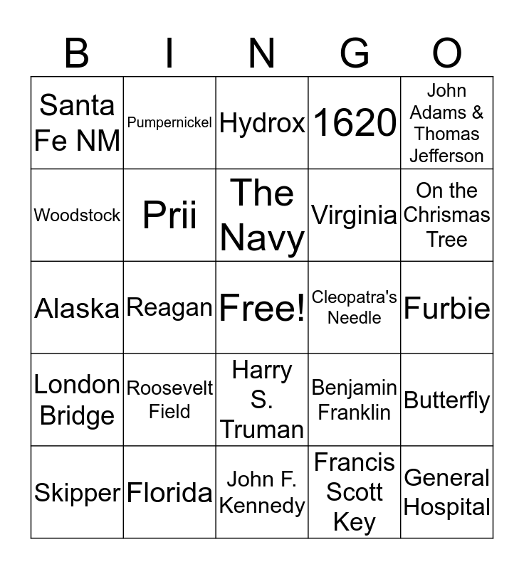 This bingo card has a free space and 29 words: Skipper, Quality, Reagan, Cigarette, Santa Fe NM, Hydrox, Prii, Roosevelt Field, Cleopatra's Needle, Florida, Furbie, General Hospital, John F. Kennedy, Francis Scott Key, On the Chrismas Tree, Carter, Harry S. Truman, London Bridge, John Adams & Thomas Jefferson, Alaska, Benjamin Franklin, General Motors, Virginia, Woodstock, 1620, Pumpernickel, Butterfly, The Navy and Edsel.