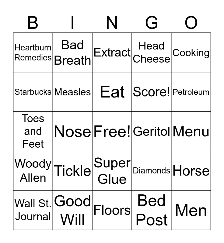 This bingo card has a free space and 29 words: Wall St. Journal, Over Easy, Nose, Loin Cloth, Heartburn Remedies, Extract, Measles, Tickle, Geritol, Good Will, Menu, Men, Floors, Bed Post, Petroleum, Take a Bath, Super Glue, Woody Allen, Cooking, Toes and Feet, Diamonds, Prosciutto, Score!, Starbucks, Head Cheese, Bad Breath, Horse, Eat and Fingers.