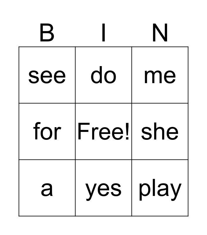 This bingo card has a free space and 25 words: here, look, yes, you, play, see, she, do, the, we, go, is, to, and, a, I, has, me, said, have, my, he, are, for and like.