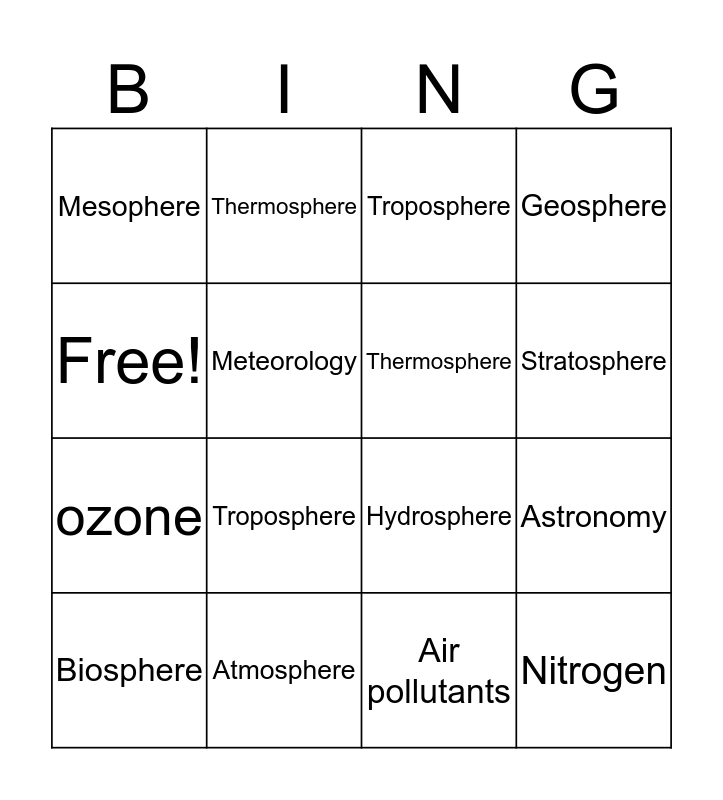 This bingo card has 16 words: Atmosphere, Astronomy, Troposphere, Mesophere, ozone, Thermosphere, Hydrosphere, Air pollutants, Free!, Meteorology, Biosphere, Geosphere, Troposphere, Stratosphere, Thermosphere and Nitrogen.