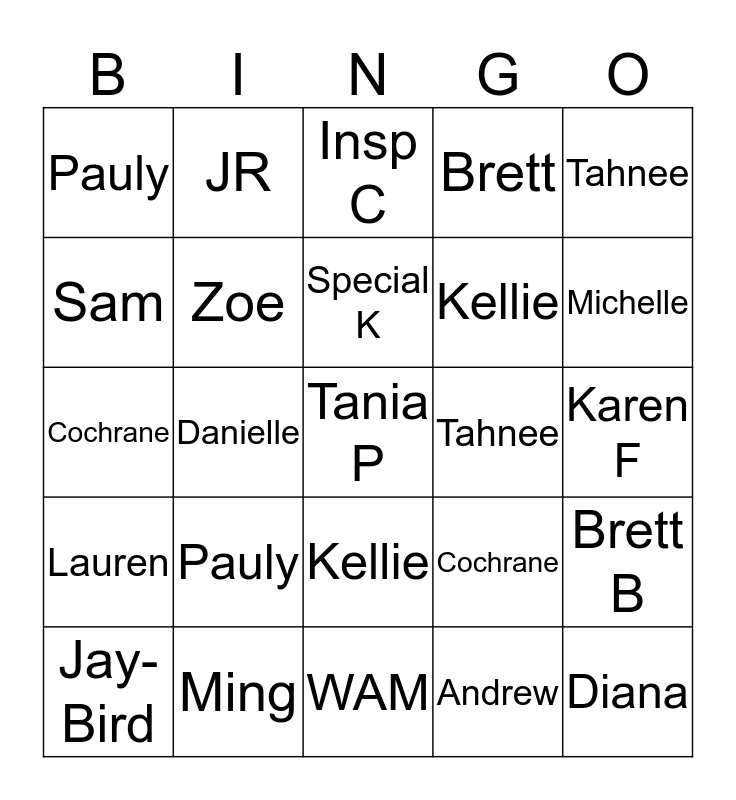 This bingo card has 25 words: Pauly, WAM, Special K, Jay-Bird, Tahnee, Pauly, Sam, JR, Tahnee, Kellie, Kellie, Cochrane, Cochrane, Brett B, Zoe, Diana, Karen F, Insp C, Michelle, Danielle, Tania P, Ming, Lauren, Brett and Andrew.