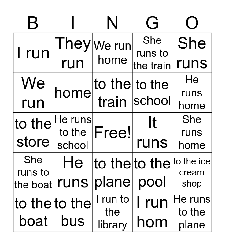 This bingo card has a free space and 24 words: He runs, to the bus, to the train, to the boat, She runs, I run, We run, They run, It runs, to the plane, to the school, to the store, to the pool, to the ice cream shop, home, I run hom, She runs home, We run home, He runs home, He runs to the school, He runs to the plane, She runs to the boat, She runs to the train and I run to the library.