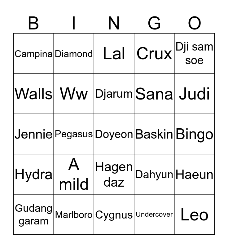 This bingo card has a free space and 24 words: A mild, Marlboro, Djarum, Gudang garam, Dji sam soe, Campina, Walls, Diamond, Baskin, Hagen daz, Sana, Jennie, Dahyun, Haeun, Ww, Undercover, Bingo, Lal, Judi, Pegasus, Leo, Hydra, Crux and Cygnus.