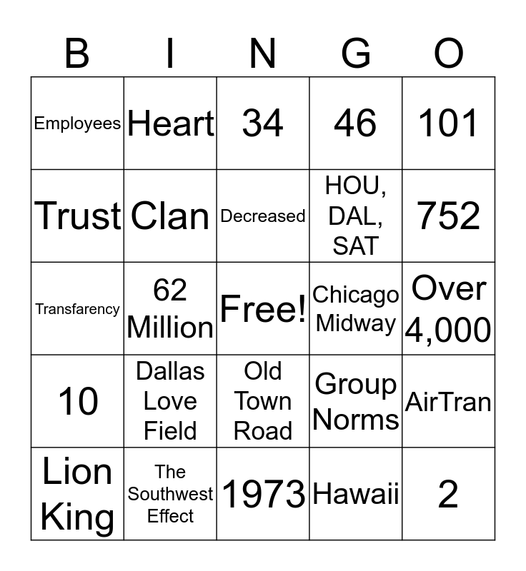 This bingo card has a free space and 39 words: Liqour, 143, LUV, Clan, Lion King, Old Town Road, Decreased, Cocktail Napkin, 101, 10, 62 Million, 46, 2, Over 4,000, Chicago Midway, Dallas Love Field, 2014, Employees, High, Group Norms, Trust, 1973, HOU, DAL, SAT, 752, Warrior, Fun-LUVing, Servant's, mentors, 175, Heart, 164 million, Diversity, 34, The Southwest Effect, Hawaii, Star Wars, AirTran, Transfarency and Wanna Get Away?.
