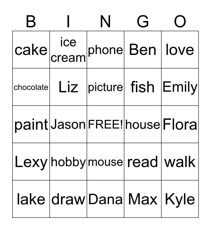 This bingo card has a free space and 24 words: hobby, draw, picture, lake, love, cake, chocolate, ice cream, house, mouse, fish, paint, read, walk, Liz, Max, Flora, phone, Emily, Jason, Kyle, Lexy, Ben and Dana.