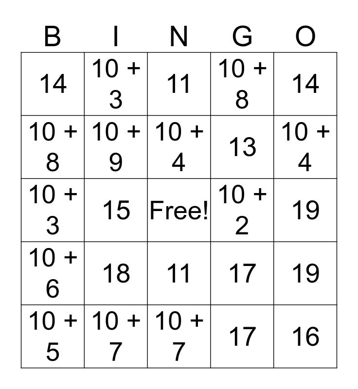 This bingo card has a free space and 29 words: 10 + 5, 12, 15, 10 + 1, 14, 11, 10 + 9, 18, 10 + 2, 10 + 7, 19, 16, 10 + 7, 17, 10 + 4, 15, 11, 10 + 6, 14, 10 + 3, 17, 16, 13, 10 + 8, 10 + 8, 10 + 3, 19, 10 + 4 and 16.