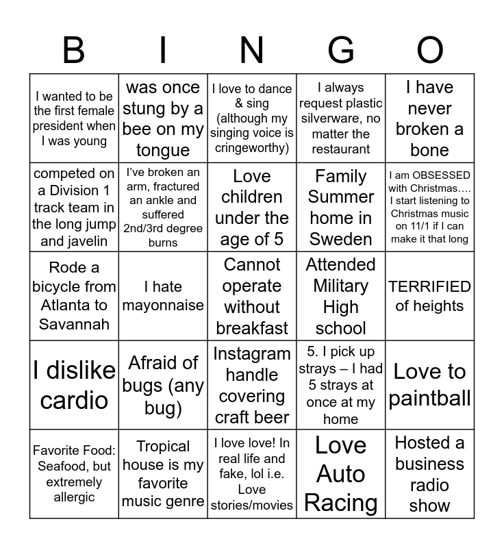 This bingo card has 25 words: Afraid of bugs (any bug), I love love! In real life and fake, lol i.e. Love stories/movies, Love children under the age of 5, Favorite Food: Seafood, but extremely allergic, I have never broken a bone, I wanted to be the first female president when I was young, competed on a Division 1 track team in the long jump and javelin, was once stung by a bee on my tongue, Attended Military High school, Instagram handle covering craft beer, Family Summer home in Sweden, Rode a bicycle from Atlanta to Savannah, 5. I pick up strays – I had 5 strays at once at my home, Love to paintball, I’ve broken an arm, fractured an ankle and suffered 2nd/3rd degree burns, Hosted a business radio show, TERRIFIED of heights, I love to dance & sing (although my singing voice is cringeworthy), I am OBSESSED with Christmas…. I start listening to Christmas music on 11/1 if I can make it that long, I hate mayonnaise, Cannot operate without breakfast, Tropical house is my favorite music genre, I dislike cardio, I always request plastic silverware, no matter the restaurant and Love Auto Racing.