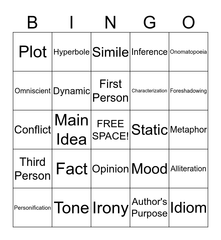 This bingo card has a free space and 24 words: Fact, Tone, First Person, Personification, Onomatopoeia, Plot, Omniscient, Hyperbole, Static, Opinion, Characterization, Conflict, Mood, Alliteration, Dynamic, Author's Purpose, Metaphor, Simile, Foreshadowing, Main Idea, Idiom, Third Person, Inference and Irony.