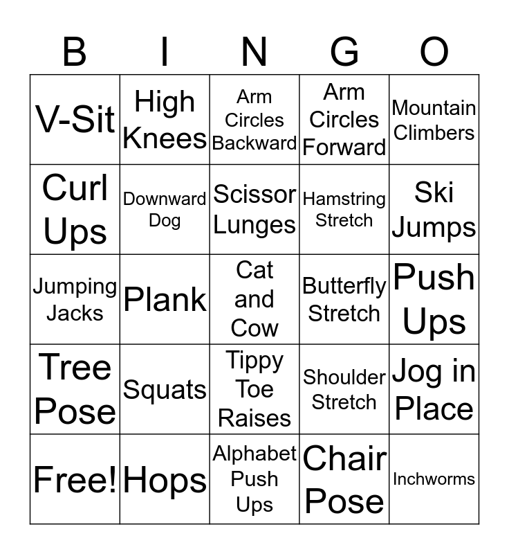 This bingo card has 27 words: Shoulder Stretch, Inchworms, Hamstring Stretch, Alphabet Push Ups, Curl Ups, Arm Circles Backward, High Knees, Tree Pose, Butterfly Stretch, Jog in Place, Jumping Jacks, Arm Circles Forward, Free!, Hops, Ski Jumps, Airplane Position, Downward Dog, Scissor Lunges, Squats, V-Sit, Push Ups, Chair Pose, Plank, Cat and Cow, Tippy Toe Raises, Mountain Climbers and Squat Jumps.