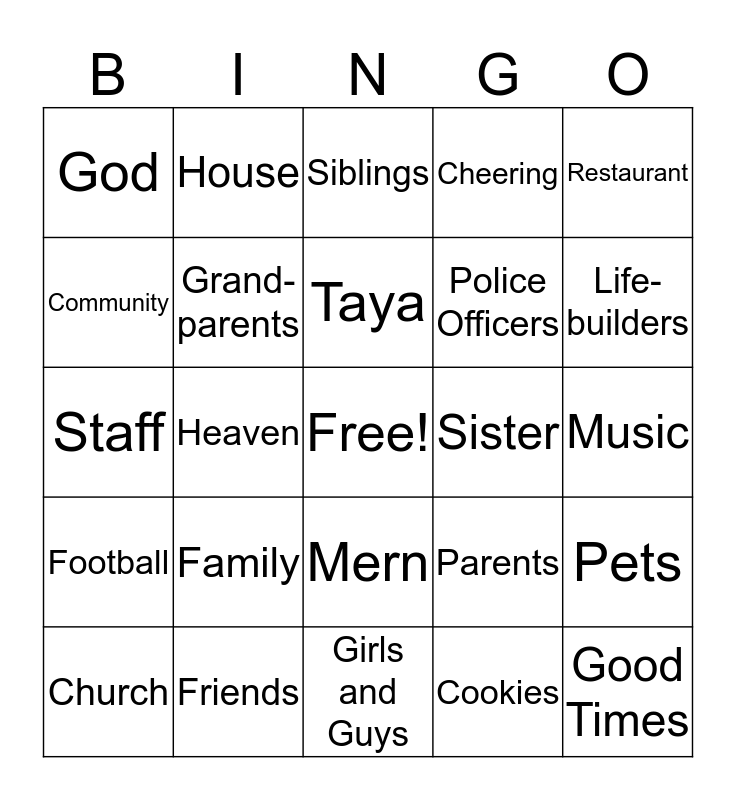 This bingo card has a free space and 24 words: Family, Friends, Taya, Church, Restaurant, God, Community, House, Sister, Mern, Police Officers, Staff, Parents, Pets, Grand-parents, Cookies, Music, Siblings, Life-builders, Heaven, Good Times, Football, Cheering and Girls and Guys.