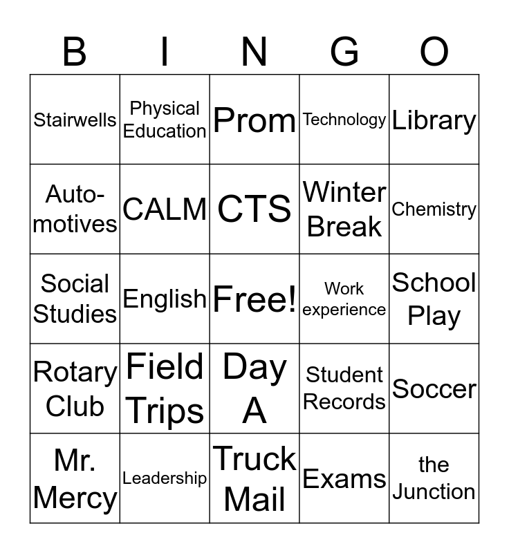 This bingo card has a free space and 74 words: Panthers, Bike-a-Thon, Prom, Grad 2020, One Page Many Worlds, Mr. Tully, Mr. Boras, Mr. Sutherland, Mr. Mercy, Cosme-tology, Arts, Drama, CTS, Auto-motives, Physics, English, Math, Chemistry, Biology, Social Studies, CALM, Physical Education, Technology, Chrome Books, the Junction, Donut Club, PD Day, ELL, LOTE, Parent Council, Library, Athletics, SRO, ISP, Awards, Exams, Music, Con-struction, The Weekly Page, PAGE time, Truck Mail, Leadership, The Rotunda, Art walk, TLC, Stairwells, Bus Passes, Field Trips, Fire Alarm, Lockdown, Debate, K&E, School Play, Sports Per-formance, First day of classes, Last day of classes, Day A, Day B, Volleyball, Soccer, Winter Break, Yearbook, Rotary Club, Career counselling, Work experience, Educational Assistants, Custodians, Admin. Asst., Student Records, Science Tech, SU, Staff wellness, Fruit bowl and school fees.