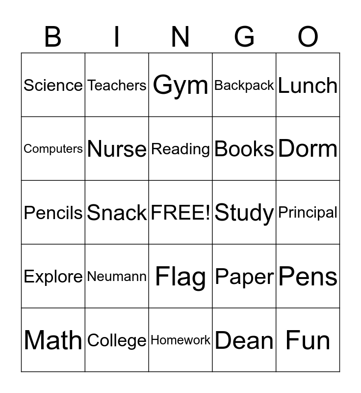 This bingo card has a free space and 24 words: Neumann, College, Reading, Math, Lunch, Science, Computers, Teachers, Study, Flag, Books, Pencils, Paper, Pens, Nurse, Dean, Principal, Gym, Dorm, Snack, Fun, Explore, Backpack and Homework.