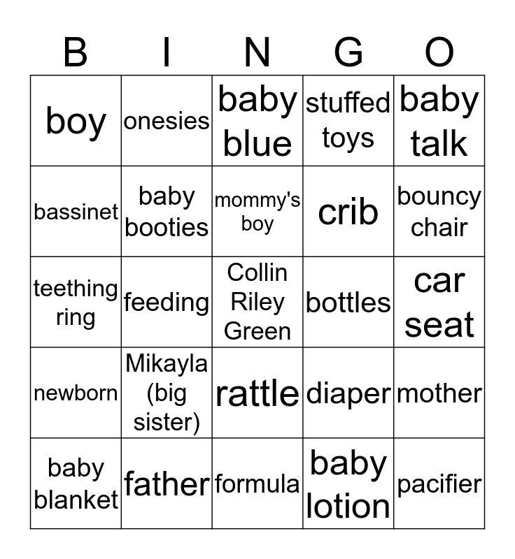 This bingo card has a free space and 24 words: Mikayla (big sister), father, mommy's boy, baby blanket, baby talk, boy, bassinet, onesies, bottles, rattle, crib, teething ring, diaper, mother, baby booties, baby lotion, car seat, baby blue, bouncy chair, feeding, pacifier, newborn, stuffed toys and formula.