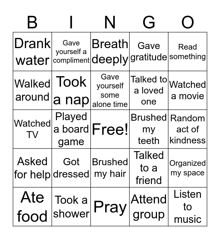 This bingo card has a free space and 24 words: Got dressed, Took a shower, Gave yourself some alone time, Ate food, Read something, Drank water, Walked around, Gave yourself a compliment, Brushed my teeth, Brushed my hair, Talked to a loved one, Watched TV, Talked to a friend, Organized my space, Took a nap, Attend group, Random act of kindness, Breath deeply, Watched a movie, Played a board game, Listen to music, Asked for help, Gave gratitude and Pray.