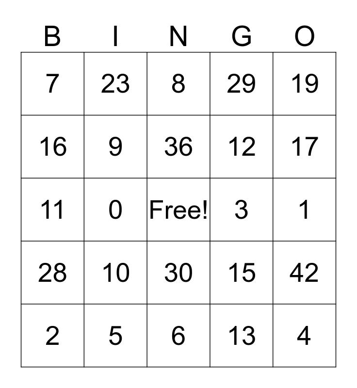 This bingo card has a free space and 29 words: 2, 14, 0, 21, 7, 8, 9, 10, 3, 5, 1, 4, 6, 13, 17, 25, 30, 28, 19, 11, 15, 20, 12, 16, 29, 23, 42, 36 and 33.