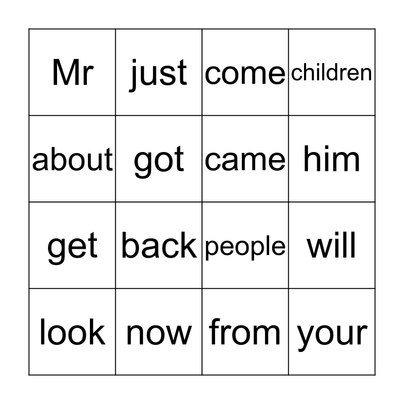 This bingo card has 20 words: look, don't, come, will, into, back, from, children, get, just, people, him, Mr, now, came, OH, about, got, their and your.