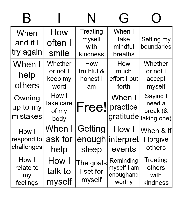 This bingo card has a free space and 24 words: When I ask for help, How I talk to myself, How truthful & honest I am, How I relate to my feelings, Setting my boundaries, When and if I try again, When I help others, How often I smile, When I practice gratitude, Getting enough sleep, How much effort I put forth, Owning up to my mistakes, How I interpret events, When & if I forgive others, Whether or not I keep my word, Reminding myself I am enoughand worthy, Saying I need a break (& taking one), Treating myself with kindness, Whether or not I accept myself, How I take care of my body, Treating others with kindness, How I respond to challenges, When I take mindful breaths and The goals I set for myself.