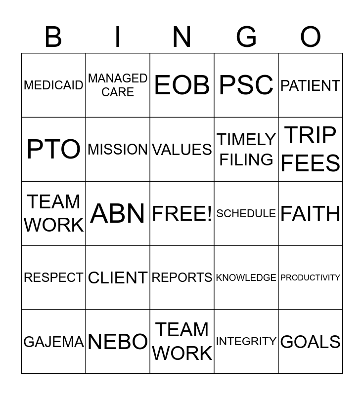This bingo card has a free space and 24 words: CLIENT, NEBO, VALUES, GAJEMA, PATIENT, MEDICAID, PTO, MANAGED CARE, SCHEDULE, REPORTS, TIMELY FILING, TEAM WORK, KNOWLEDGE, PRODUCTIVITY, MISSION, INTEGRITY, FAITH, EOB, TRIP FEES, ABN, GOALS, RESPECT, PSC and TEAM WORK.