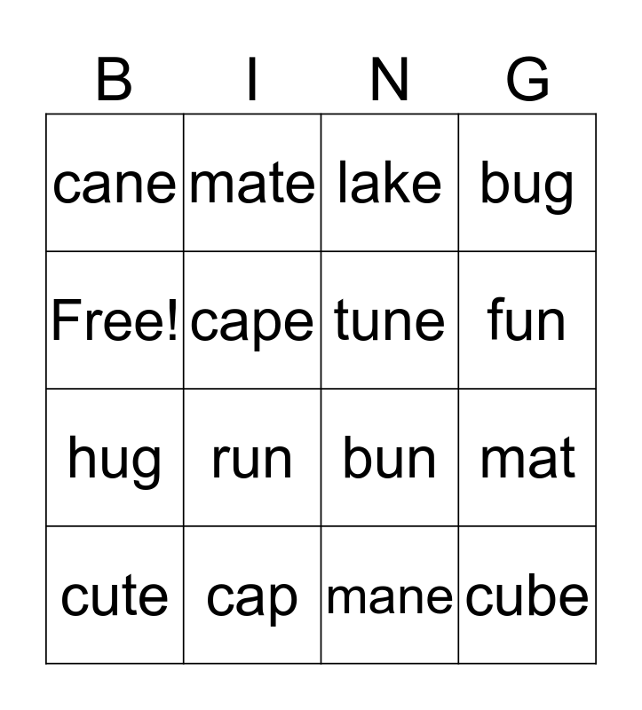 This bingo card has 16 words: cap, mat, lake, cane, hug, mate, bun, mane, Free!, cape, cute, bug, run, fun, tune and cube.