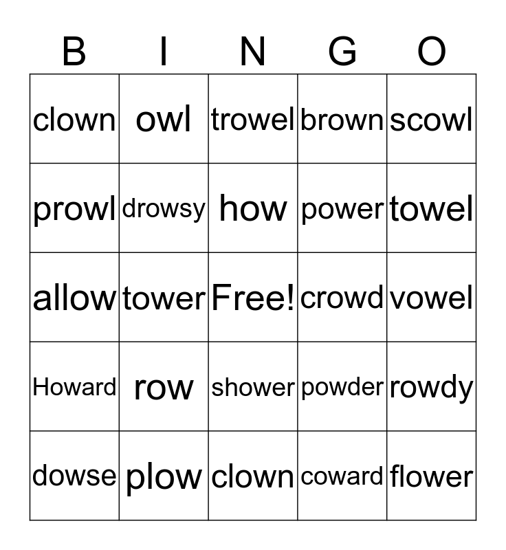 This bingo card has a free space and 24 words: row, plow, how, dowse, scowl, clown, prowl, owl, crowd, shower, power, allow, powder, rowdy, drowsy, coward, vowel, trowel, towel, tower, flower, Howard, brown and clown.