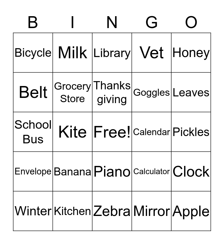 This bingo card has a free space and 25 words: Banana, Zebra, Thanks giving, Winter, Honey, Bicycle, Belt, Milk, Calendar, Piano, Goggles, School Bus, Calculator, Clock, Grocery Store, Cereal, Pickles, Library, Leaves, Kite, Apple, Kitchen, Envelope, Vet and Mirror.