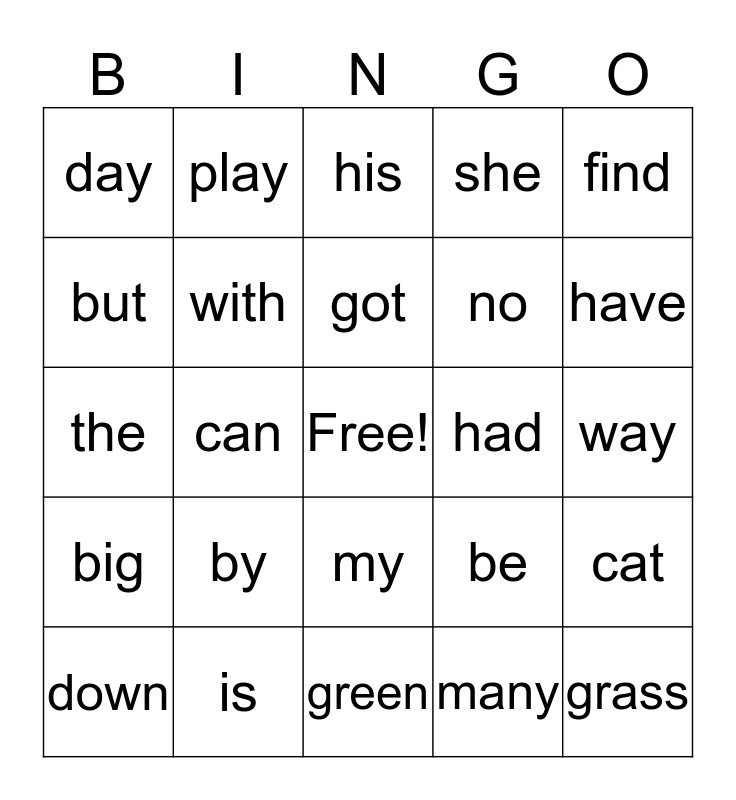 This bingo card has a free space and 34 words: little, many, then, get, big, with, find, down, play, your, got, his, this, been, had, have, is, the, by, be, my, me, day, way, green, grass, she, yes, no, but, am, can, cat and dog.