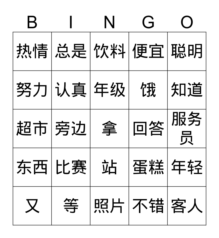 This bingo card has 25 words: 比赛, 照片, 年级, 又, 聪明, 热情, 努力, 总是, 回答, 站, 饿, 超市, 蛋糕, 年轻, 认真, 客人, 服务员, 饮料, 知道, 旁边, 拿, 等, 东西, 便宜 and 不错.