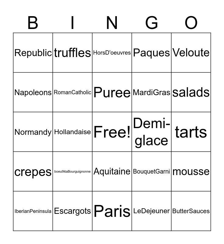 This bingo card has a free space and 57 words: MediterraneanSea, IberianPeninsula, Renaissance, Republic, Paris, French, RomanCatholic, BastilleDay, MardiGras, Noel, Paques, HauteCuisine, Provincial, Nouvelle, Roux, Bechamel, Veloute, Hollandaise, Vinaigrette, ButterSauces, Demi-glace, FinesHerbes, BouquetGarni, HorsD'oeuvres, Consommes, Puree, Cream, Pate, salads, Cheese, baguette, Brioche, Croissants, souffles, tarts, Napoleons, eclairs, Normandy, Brittany, crepes, truffles, Aquitaine, Cassoulet, Ratatouille, aioli, bouillabaisse, boeufAlaBourguignonne, Escargots, quiche, lePetitDejeuner, CafeAuLait, LeDejeuner, LeDiner, PateAchoux, omlete, mousse and vichyssoise.