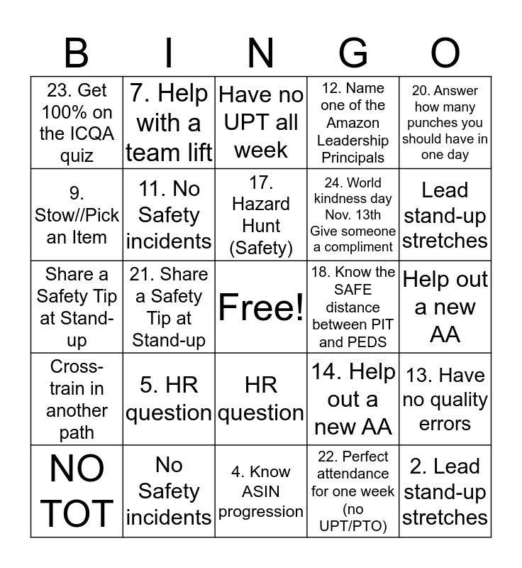 This bingo card has a free space and 48 words: 1. Donate an item to the food drive, 2. Lead stand-up stretches, 3. NO TOT, 4. Know ASIN progression, 5. HR question, 6. Cross-train in another path, 7. Help with a team lift, 8. Pick up trash, 9. Stow//Pick an Item, 10. Answer a Safety question, 11. No Safety incidents, 12. Name one of the Amazon Leadership Principals, 13. Have no quality errors, 14. Help out a new AA, 15. No missed punches all week, 16. Answer CFA questions (HR), 17. Hazard Hunt (Safety), 18. Know the SAFE distance between PIT and PEDS, 19. Have no UPT all week, 20. Answer how many punches you should have in one day, 21. Share a Safety Tip at Stand-up, 22. Perfect attendance for one week (no UPT/PTO), 23. Get 100% on the ICQA quiz, 24. World kindness day Nov. 13th Give someone a compliment, Donate an item to the food drive, Lead stand-up stretches, NO TOT, Know ASIN progression, HR question, Cross-train in another path, Help with a team lift, Pick up trash, Stow//Pick an Item, Answer a Safety question, No Safety incidents, Name one of the Amazon Leadership Principals, Have no quality errors, Help out a new AA, No missed punches all week, Answer CFA questions (HR), Hazard Hunt (Safety), Know the SAFE distance between PIT and PEDS, Have no UPT all week, Answer how many punches you should have in one day, Share a Safety Tip at Stand-up, Perfect attendance for one week (no UPT/PTO), Get 100% on the ICQA quiz and World kindness day Nov. 13th Give someone a compliment.