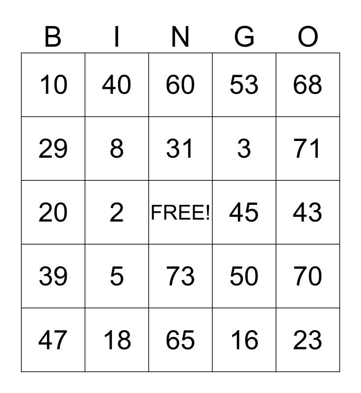 This bingo card has a free space and 24 words: 5, 18, 31, 47, 68, 10, 29, 40, 45, 73, 3, 20, 50, 70, 8, 16, 43, 60, 71, 2, 23, 39, 53 and 65.