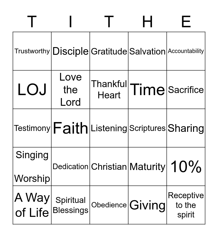 This bingo card has a free space and 29 words: Steward, Spiritual Blessings, Gratitude, Responsibility, Accountability, Trustworthy, Love the Lord, Thankful Heart, Scriptures, 10%, A Way of Life, Faith, Giving, Receptive to the spirit, Testimony, Pure Love of Christ, Obedience, Maturity, Sacrifice, Singing Worship, Dedication, Talent, Time, Sharing, LOJ, Disciple, Christian, Salvation and Blessings.